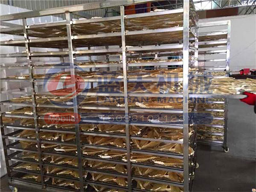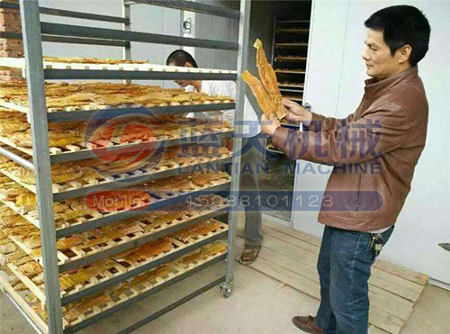 把處理過的竹筍均勻有序的擺放在不銹鋼托盤上,把推車推入烘干房?jī)?nèi),在烘干的過程中,溫度控制在45-60度,烘干時(shí)間為48個(gè)小時(shí),直至竹筍呈金黃色就表示烘干完成,鮮筍的水份含量較大,通過壓制在烘干,時(shí)間會(huì)縮短不少。